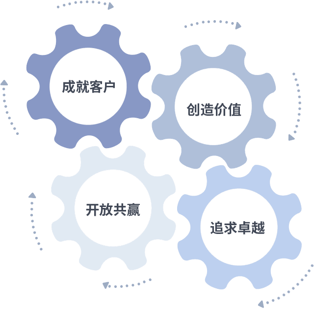 成就客户是一切决策的出发点,,,创造价值是衡量所有工作的标准,,,追求卓越是我们做事做人的态度,,,,开放共赢是我们的格局也是最终的结果。。。。价值观的齿轮环环相扣,,,,推动着组织里的每个人不断向前。。。
