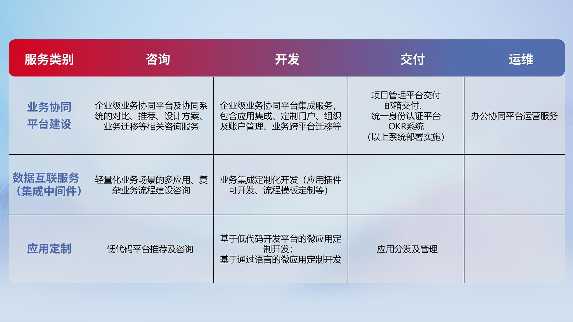 针对钉钉、、、企微、、IDaas等平台级产品提供产品的规划、、、、方案、、交付、、定制化开发等服务,,实现如统一协同办公、、、、智能客户服务、、混合会议管理、、智能数据查询、、、等业务场景,,实现数字化转型。。