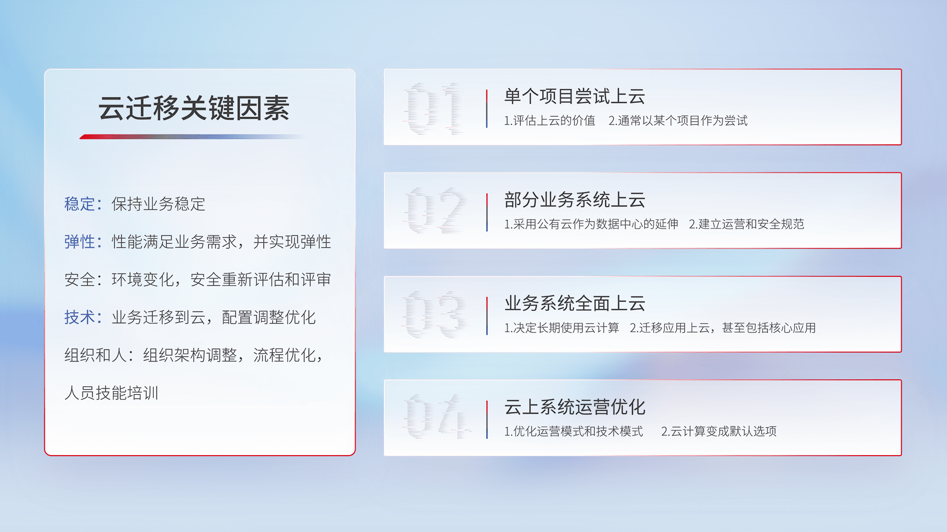 结合实际业务,,从规划设计、、云平台选型、、、、云原生改造、、、数据迁移、、、、集成交付,,,迁移全过程为客户识别最佳上云路径,,,做好风险识别管理,,,设计网络架构、、身份权限、、、安全审计合规、、、操作审计、、、日志审计、、、、监控告警策略、、、、多站点容灾设计等,,,,对云上基础设施进行整体规划,,,提升IT治理水平,,以满足弹性、、高可用、、、、高性能的需求。。