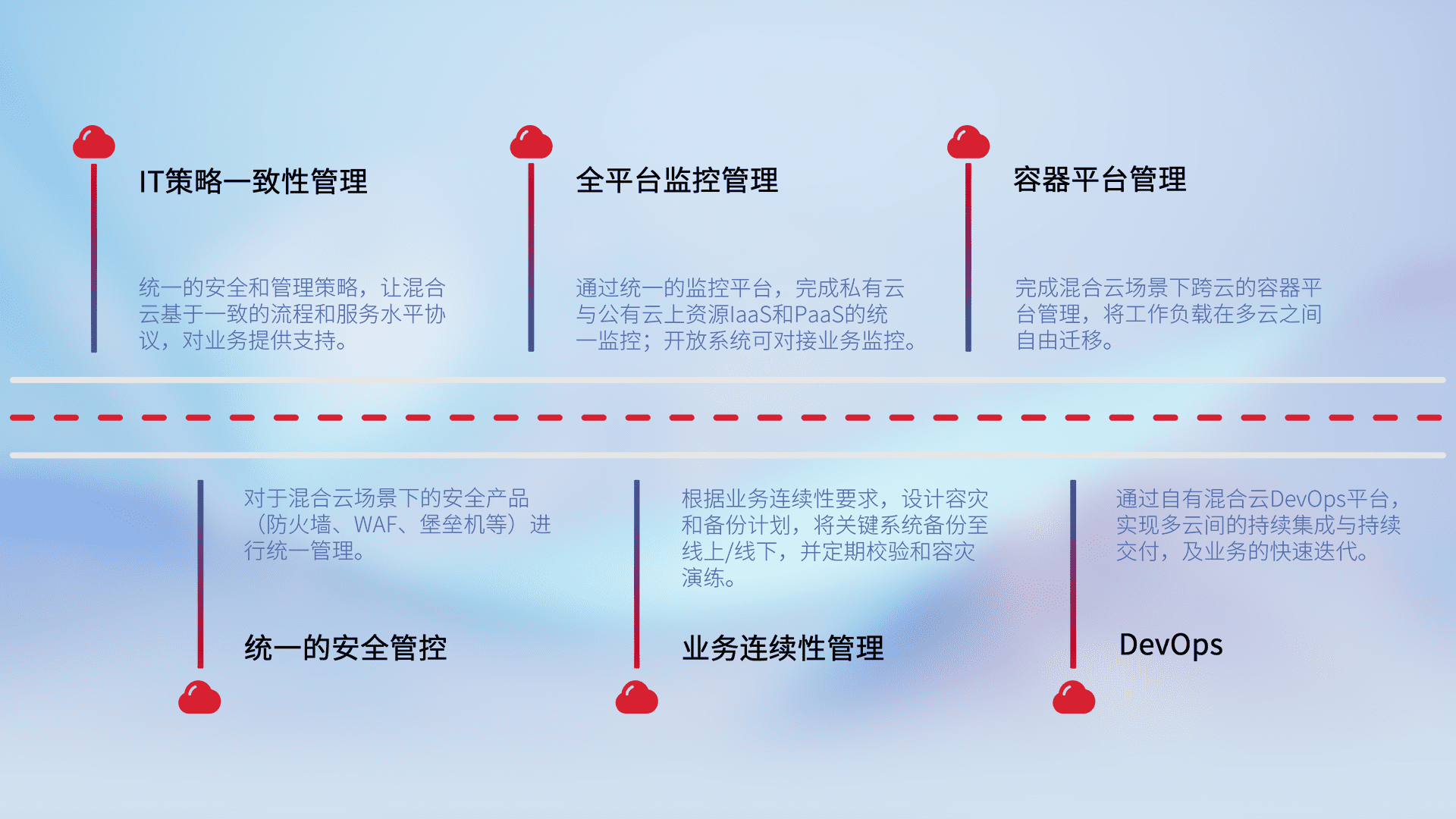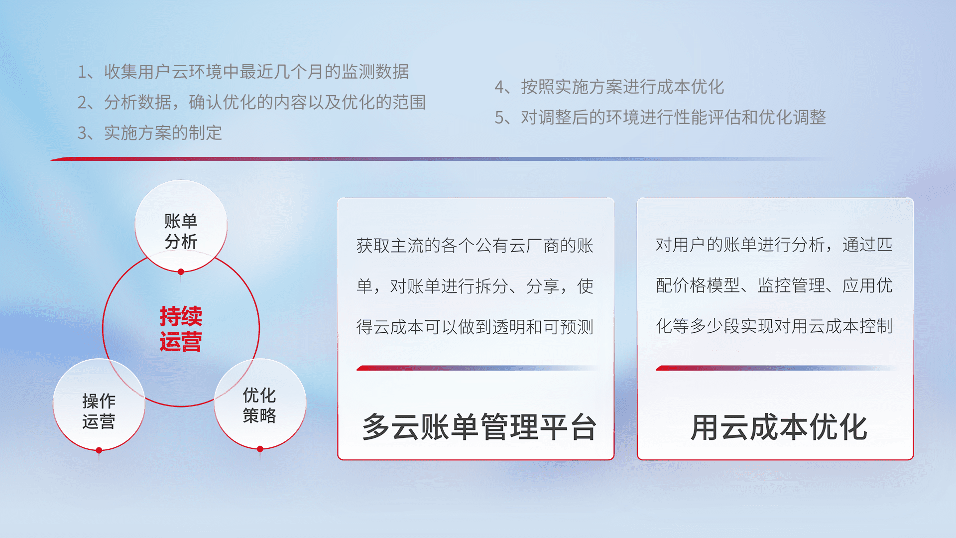 通过多云纳管,,,以统一的资源数据模型把客户的云资源进行抽象和封装,,,进而实现对多云资源的统一操作,,,,保障云资源管理的可靠性、、、、稳定性与可用性。。量身定制化运维内容,,,,配置、、、、开发运维、、、、补丁管理、、、备份、、、监控、、认证和访问管理、、、、审计和日常巡检等,,,,保障在用云过程中的可靠度,,稳定度以及高可用率。。。